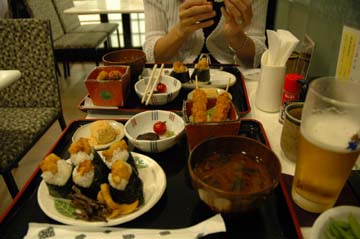 天むす定食と生ビールを注文。串カツもついておりなんともGoodなものである。