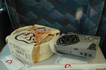 帰りの新幹線では、名古屋の気分をと、ひつまぶし弁当と地雷也の天むすを食べる。