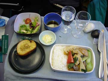 ビールとつまみを堪能しちょっと経つと、お待ちかねの機内食が始まる。